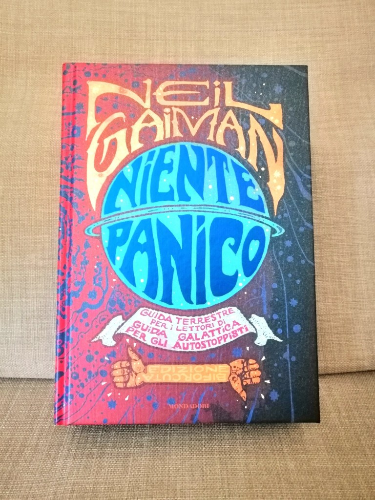 Il libro in questione è double face e contiene, da una parte, Guida galattica per gli autostoppisti – Trilogia più che completa in cinque parti – di Douglas Adams e dall’altra, Niente panico – Guida terreste per i lettori di Guida galattica per gli autostoppisti – di Neil Gaiman.